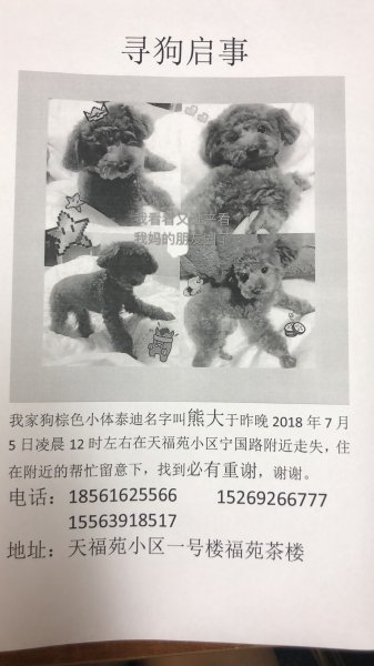 我家的黄色小型泰迪在前天凌晨失踪了。它走丢在天福苑小区的宁国路,请大家帮忙寻找。找到必有重谢。联系电话为15269266777或者15563918517。地址在天福苑小区福苑茶楼。谢谢大家!