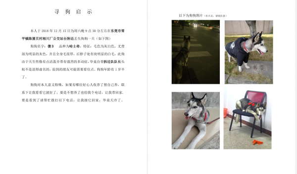 失踪宠物寻找 | 东莞常平镇丢失一只成年母哈士奇 傻B